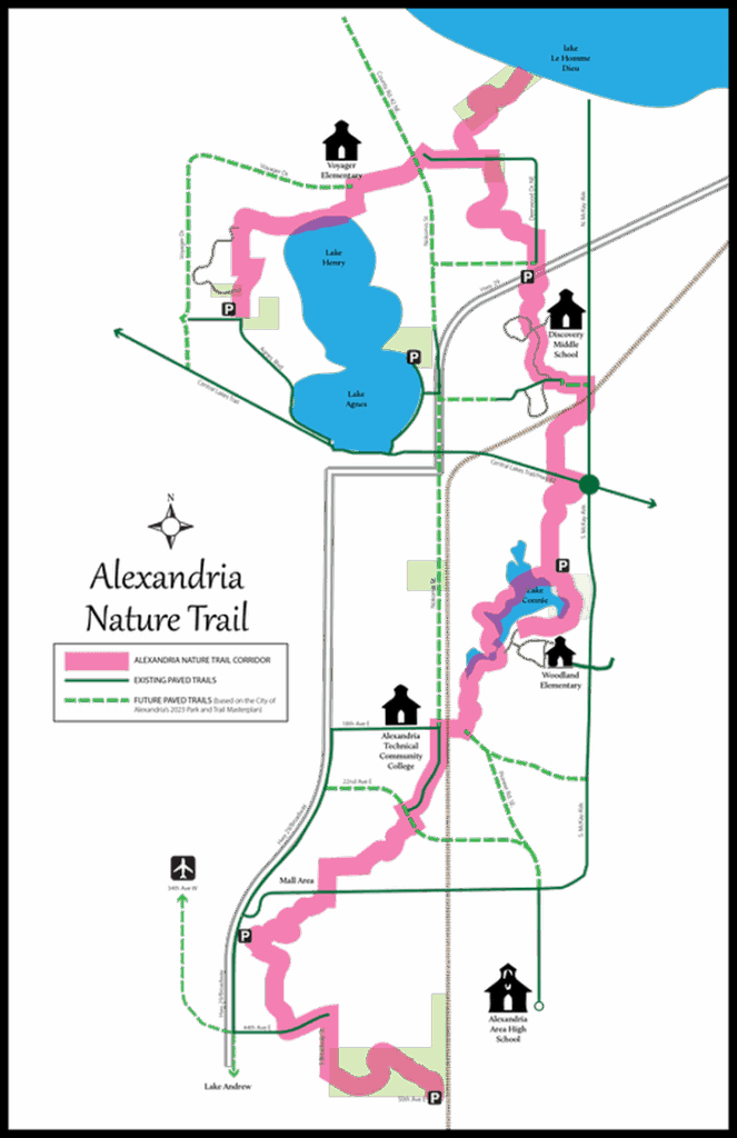 The planned trail route runs from I-94 up to Lake Le Homme Dieu, intersecting with existing paved trails and connecting Alexandria Technical & Community College, Woodland Elementary School, Discovery Middle School, Voyager Elementary School, as well as neighborhoods and the business district. Two schools use nearby grass trail segments for classroom activities, and the City of Alexandria plans to pave a section near Woodland Elementary. The City is currently working on securing easements before moving ahead with installing segments of the trail over the coming years.