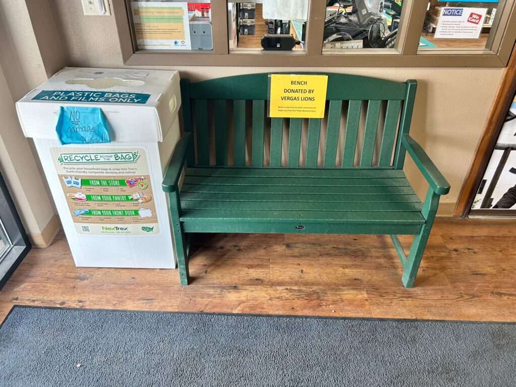 Vergas has two of these benches: one at the liquor store and the other at the community center. At the recent event, the Vergas Lions Club sought to sort and prepare another 1,000 pounds of household plastics for a new bench at the pickleball court.