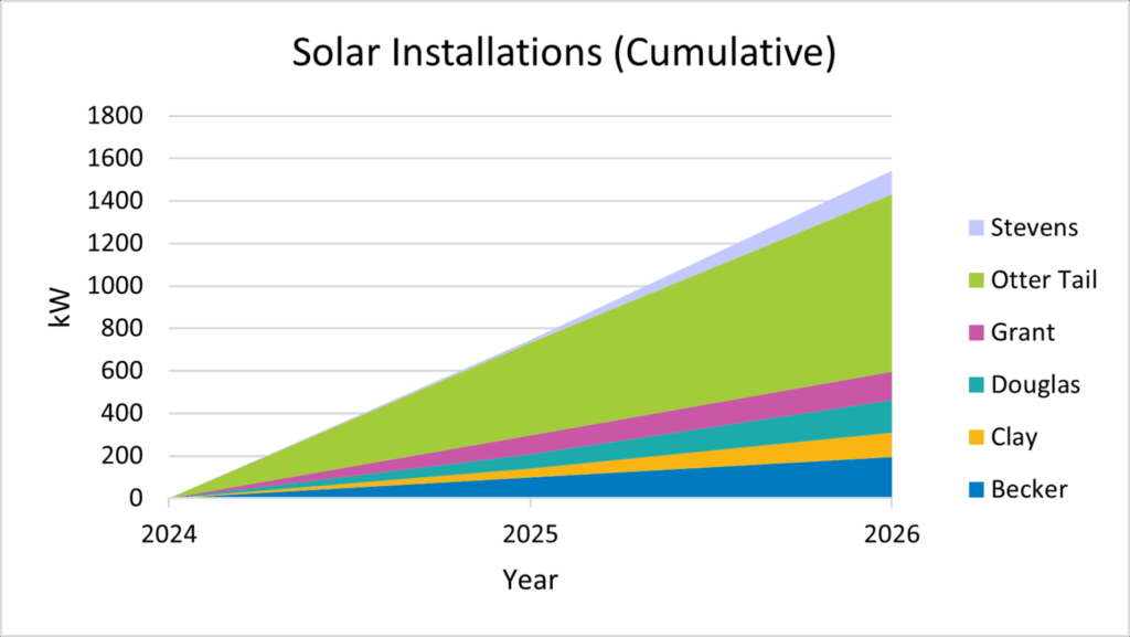 In 2024, West Central Initiative began building regional capacity to support distributed solar development across west central Minnesota. Through our Municipal Solar Cohort, we supported 10 small-scale solar projects in 2025 by providing technical assistance and connecting communities to financial resources and incentives. We expect to support an additional 13 community solar projects in 2026. Together, these municipal projects totaled nearly 450 kW of installed solar in 2025, with another 600 kW projected next year.