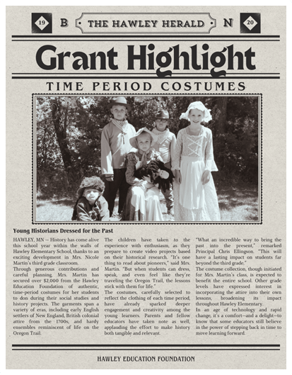 Founded in 2002 as a 501(c)(3) nonprofit, the Foundation was created to provide lasting support for our schools. In 2019, after a period of dormancy, the Foundation was relaunched with a renewed mission: to be the only organization in Hawley focused exclusively on classroom impact.
